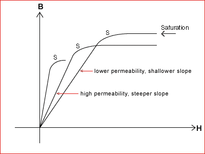 Note that H is a function of input current. The unit for H in the above formula is in Oersted. The conversion from Oersted to A/m or A/cm is one Oersted = 1.2566 A/cm. As the current swings from positive to negative the flux changes as well, tracing the curve. The permeability of a magnetic material is the ability of the material to increase the flux intensity or flux density within the material when an electric current flows through a conductor wrapped around the magnetic materials providing the magnetization force. The higher the permeability, the higher the flux density from a given magnetization force. If you look at the BH loop again, you will note that the permeability is actually the slope of the BH curve. The steeper the curve, the higher the permeability as shown below. |