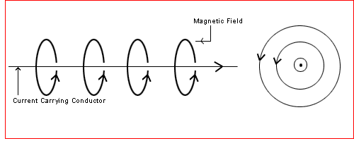 When a electric current flows through a conductor ( copper wire), it generate a magnetic field. The magnetic field is strongest at the conductor surface and weakens as its distance from the conductor surface is increased. The magnetic field is perpendicular to the direction of current flow and its direction is given by the right hand rule shown below. | ||||